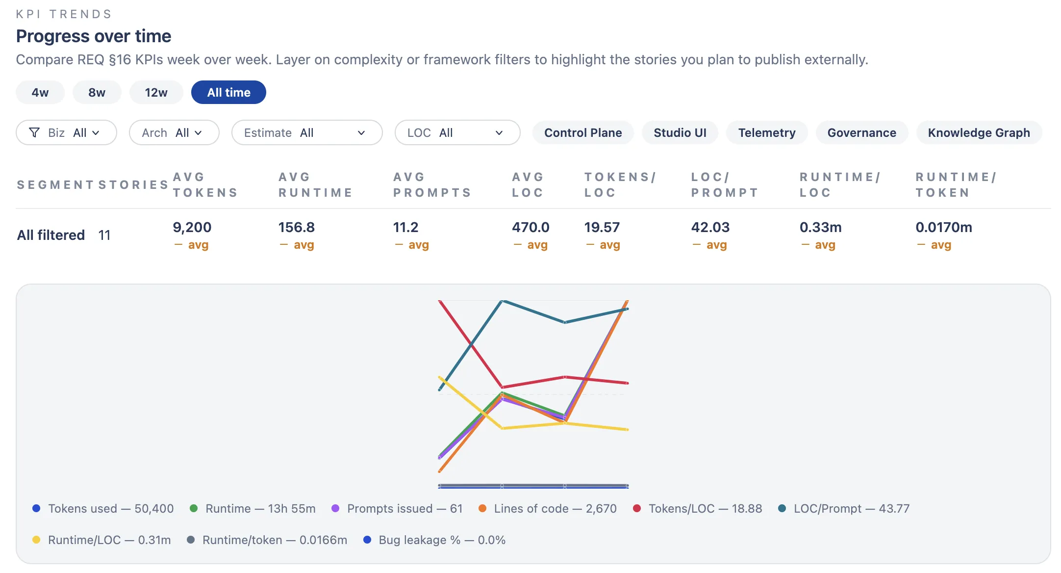 Each of those items will also include a set of KPIs I’ll track—runtime of every agent, number of tokens used, number of lines of code generated, and different indicators of code quality such as complexity and churn, basically everything SonarQube provides.